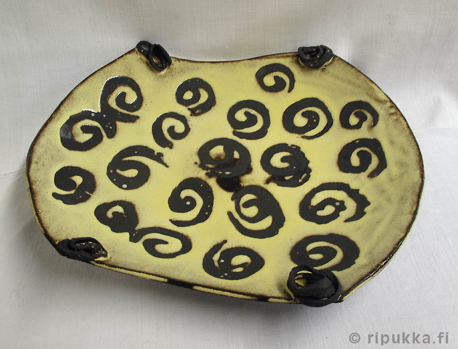 Koukerokuvioinen keramiikkavati, kivitavarakeramiikkaa, pituus 39,5 cm, leveys 34 cm, korkeus 7,5 cm