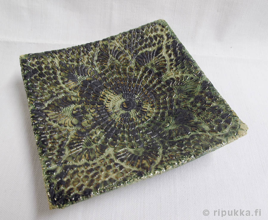Keraaminen pitsilautanen, kivitavarakeramiikkaa, leveys 20 cm, pituus 20 cm, korkeus 5 cm